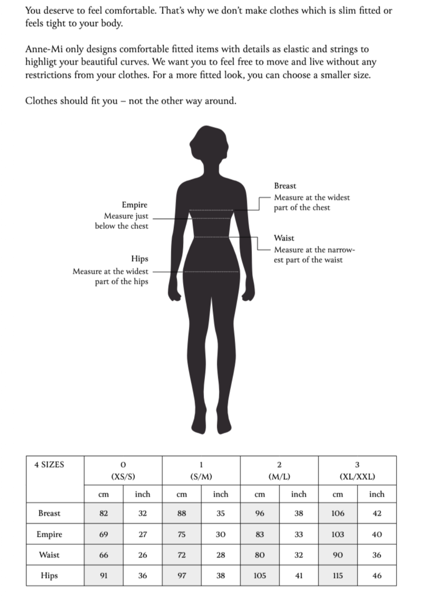 Anne-mi er designet til en oversized/løs pasform – Afhængigt af din foretrukne pasform anbefaler vi enten at vælge din normale størrelse eller en størrelse mindre for et mere normalt/fittet look.